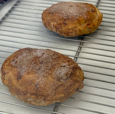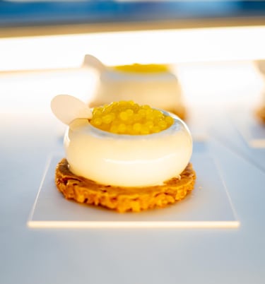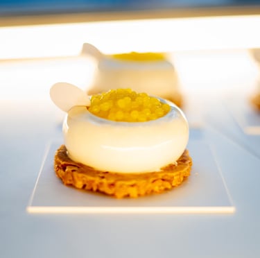 Hojaldre relleno de cabello de ángel infusionado con especias y naranja.