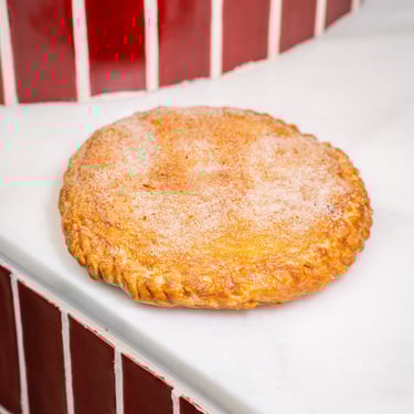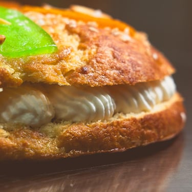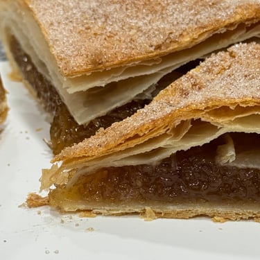 Hojaldre relleno de cabello de ángel infusionado con especias y naranja.
