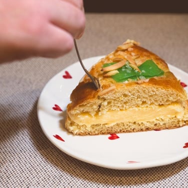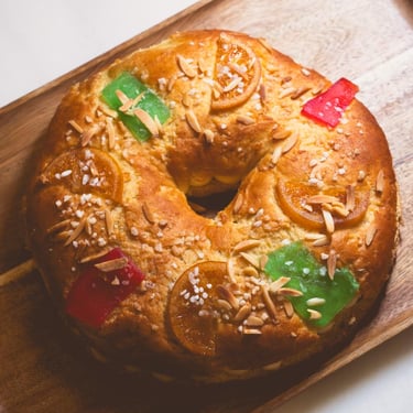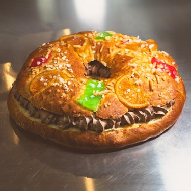 Roscón de harina de tritordeum ecológica, masa madre con 24 horas de fermentación, aromas naturales de azahar y cítricos. Relleno de nata, crema pastelera o trufa hecha al momento.