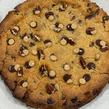 1KG de galleta crujiente de chocolate negro belga, chocolate belga de caramelo y pecanas con un toque de sal.